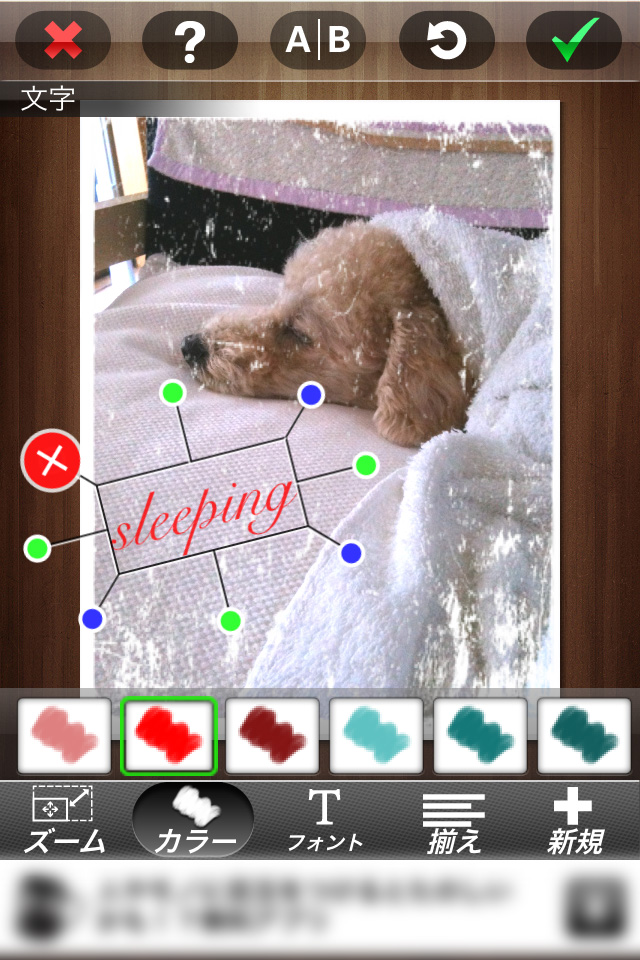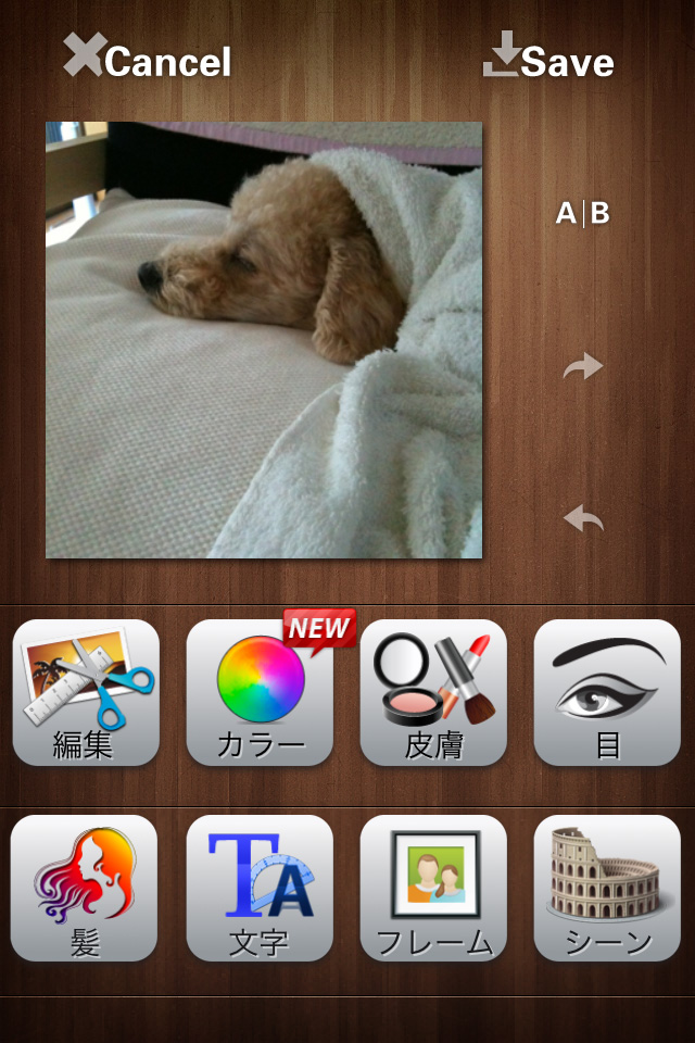 撮りたての写真やカメラロールに保存されている写真をサクサク・自由自在に加工できちゃうアプリです。好きな写真を選択すると、左のような画面が表示されます。「編集」をタップすると、画像の回転・カット・ズーム・絵画(手描き入力)が、「カラー」をタップすると、彩度調整・特効(エフェクトフィルター)・モザイク…などの加工ができます。右の写真は、彩度調整をし、フレームをつけて文字を入力してみました。大分雰囲気が変わりましたよね!