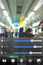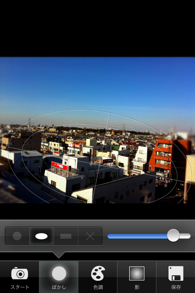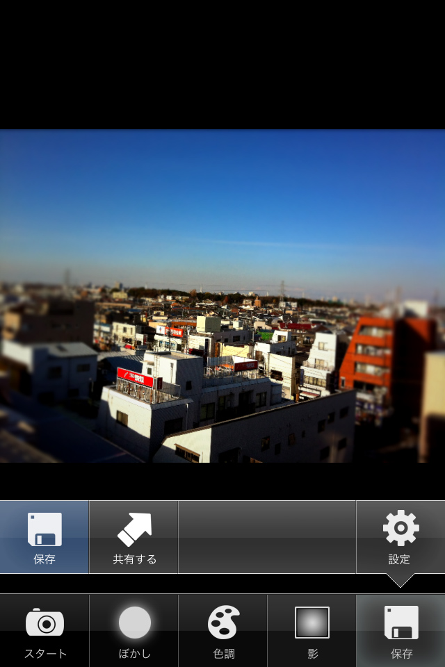 このアプリ最大の特徴は、撮った風景などをミニチュア風に加工できるところです。ミニチュア風にするためには、“ぼかし”機能を上手に使いましょう。画面の中心部分以外のところに、弱~中ぐらいのぼかしを入れて、彩度(鮮やかさ)とコントラスト(明るさの強弱)を強めにかけると、建物や人をミニチュア風に加工することができちゃいます。ぼかしは、円・楕円・四角型に入れることができますよ。