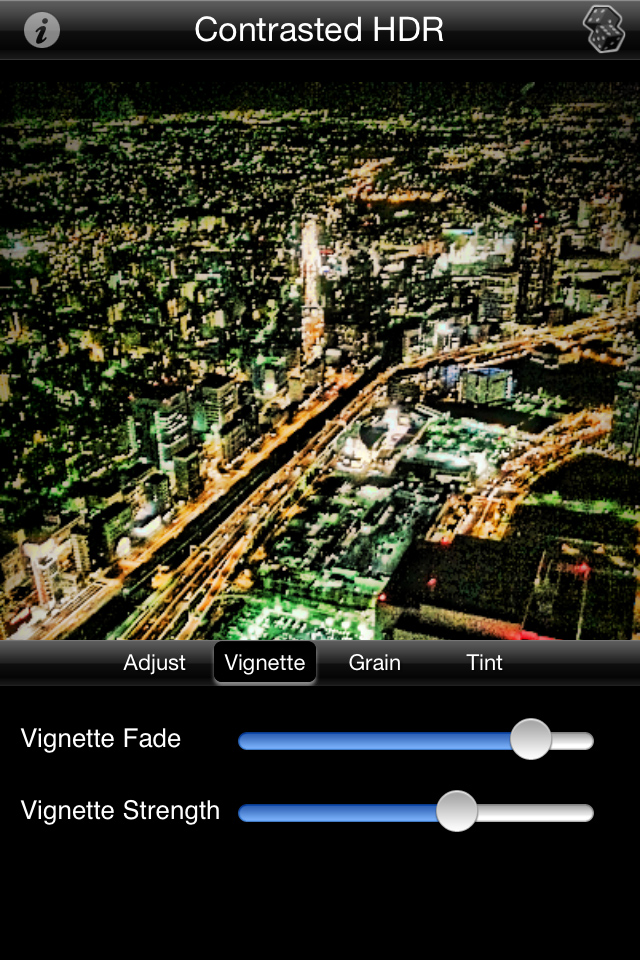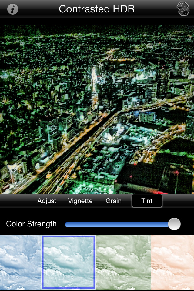お次は夜景です。「Style」の隣に表示される「Adjust」アイコンをタップすると、色味や影、彩度などを自分で調整しながらHDR加工することができますよ。左の画像が、やりたい放題に調整バーをいじって作ってみた画像ですが、かなりエレクトリカルな感じになりました。ちなみに右画像のように「Tint」をタップすると、全体に色味を敷くことができて、また違った雰囲気の写真に仕上がります。