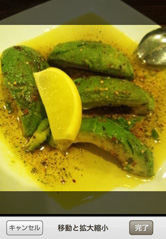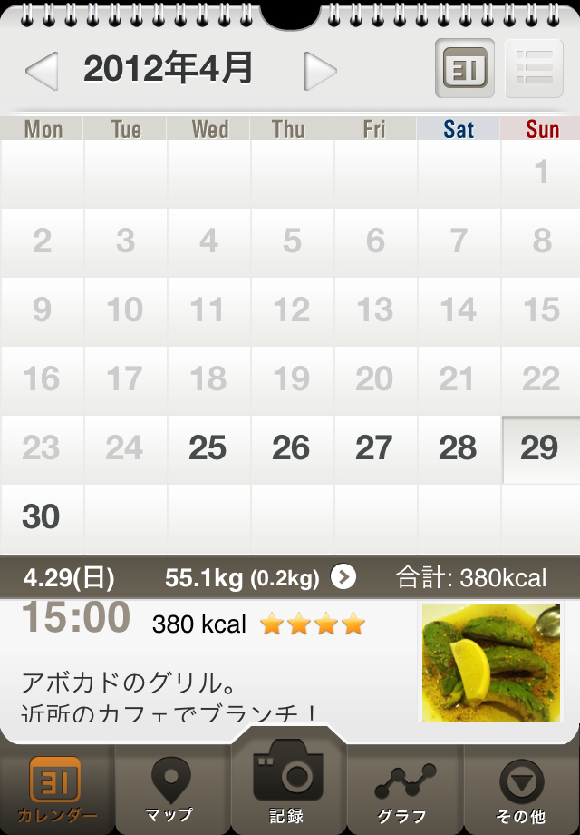 今回はiPhone版の「eat-app」で解説しますね。アプリを起動すると、カレンダーが表示されます。それでは、今日の食事を記録してみましょう。画面下部のメニュー、カメラボタンの『記録』をタップして、記録方法を選択します。カメラで撮影する場合は[カメラ]、カメラロールから選択する場合は[カメラロール]、写真を使わずに記録だけ残す場合は[メモのみ記録]が選べます。今回は[カメラロール]を選択してみました。写真を選択して、移動・拡大・縮小をしながら、正方形の枠に収めます。[完了]をタップするとプレビューが表示されるので、確認したら[次へ]をタップ。メモの画面が表示されます。メモには、[コメント](140文字のコメントを入力)・[Twitterに投稿](Twitter投稿のON/OFFを選択)・日時(食事した日時を記録)・[カロリー](カロリー値を入力)・[スポット名](食事した場所を名称及び住所で設定)・[評価](5段階で評価)の情報を記録することができます。