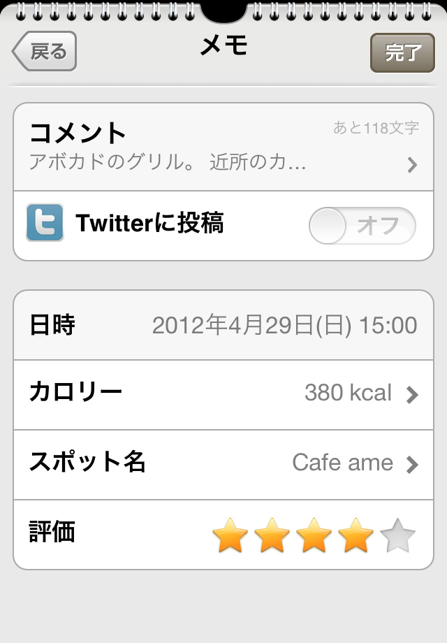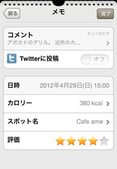 記録した写真とメモは、カレンダーに登録されます。日付をタップすると、その日の記録が表示されます。カレンダー画面右上の切り替えボタンをタップすると、カレンダー表示と一覧表示を切り替えることができます。一覧表示にするとコメントがより見やすくなりますね。記事部分をタップすると、さらに詳細画面が表示されます。詳細画面では、内容の編集や削除ができます。詳細画面右上の[編集]ボタンをタップしましょう。メモの[スポット名]に名称や住所を入力しておくと、『マップ』の地図で詳しく確認することができます。『マップ』では、記録時におおよその記録場所を、位置情報として自動取得しているため、特に意識しなくてもマップに記録が増えていきます。グルメマップとして活用しちゃいましょう。また、記録と同時にTwitterに投稿すると、あなた専用のマイページが開設され、過去の記録をWEBサイトからも振り返ることができるようになります。