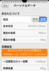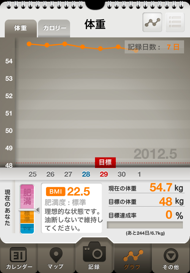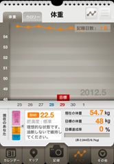 「eat-app」は食事記録だけではなく、健康管理にもお役立ちのアプリなんです。『その他』のメニューから、[パーソナルデータ(目標設定)]をタップ。[性別][生年月日][現在の身長][現在の体重]などのパーソナルデータを、できるだけ正確に入力してください。次に、目標設定をします。入力したデータから、[あなたにおすすめの目標設定]がオレンジの枠に表示されます。おすすめの目標設定を参考にしながら、[一日摂取カロリー目標][目標体重][目標達成予定日]を設定。パーソナルデータを設定したら、毎日の食事記録の際に[カロリー]を登録しておきましょう。また、カレンダー日付横の>マークをタップして、体重も毎日記録してください。『グラフ』メニューをタップすると、[体重]と[カロリー]の二種類のグラフを見ることができます。グラフの下には、身長と体重のバランスを示すBMI・肥満度・アドバイス・現在の体重・目標の体重・目標達成率を確認することができます。