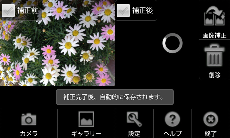 補正したい写真を表示させたら、画面右上の[画像補正]ボタンをタッチするだけ。画面左側に補正前の写真が表示され、画面右側が読み込み中の表示になります。数秒待つと、画面右側に補正後の写真が表示されます。補正後の写真は、自動的に保存されます。補正後の写真を見てみましょう。花のピンクや黄色、葉の緑が色鮮やかになっています。特に不自然に見えるところもありません。ボタンをタッチして数秒待つだけで、こんなにきれいに補正されるなんて、驚きですね!