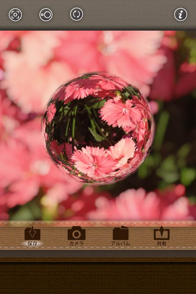 「ビー玉と共に MarbleCam」は、ビー玉を覗きこんだときに見える逆さまの景色を、ビー玉ごと撮影できるアプリです。本来、このような写真は、カメラに宙玉レンズと呼ばれるレンズを装着しないと撮影できないのですが、このアプリを使えば、かんたんに素敵な写真を撮ることができますよ!それでは早速使ってみましょう。アプリを起動すると、画面下部に[保存][カメラ][アルバム][共有]のメニューが表示されます。その場で写真を撮影する場合は[カメラ]、保存されている写真から選択する場合は[アルバム]をタップしましょう。今回は[アルバム]から花の写真を選択してみました。写真を選択すると、すぐに宙玉写真へと加工されます。素敵ですね!