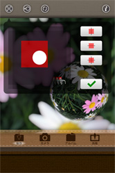 ビー玉写真の画面の左上には、機能アイコンが表示されています。左から、ビー玉の位置を変えられる機能、ビー玉のサイズを25段階で選択できる機能、ビー玉を90度・180度・270度に回転できる機能です。右上の( i )マークをタップすると、[画像の形状][解像度]の設定ができます。いろいろ調整して、好みの写真に加工しましょう!