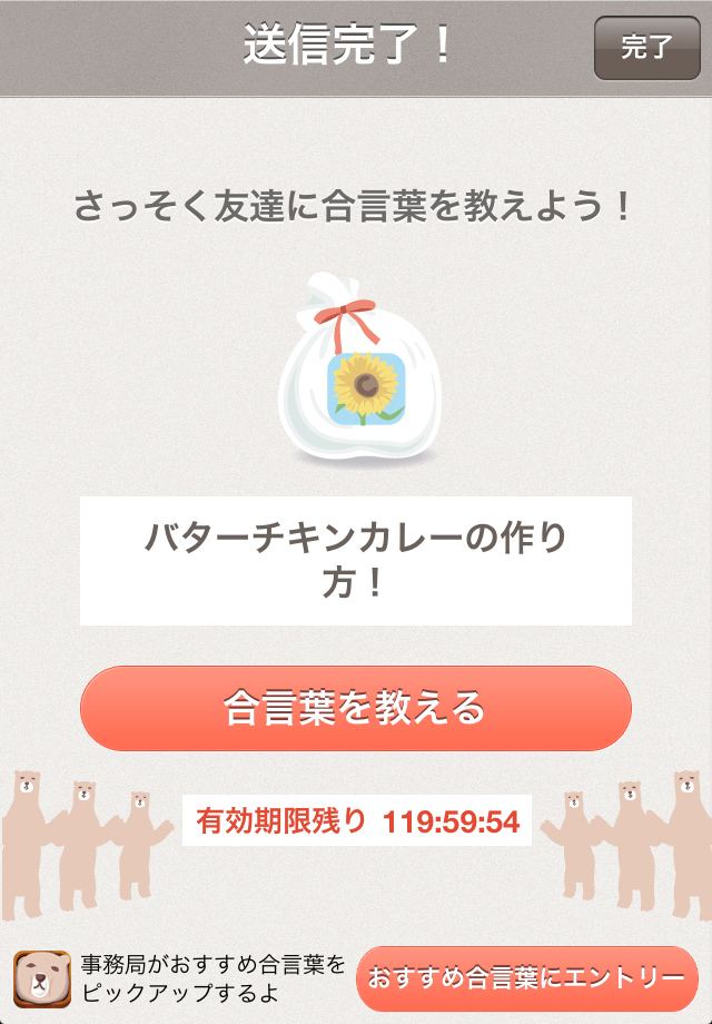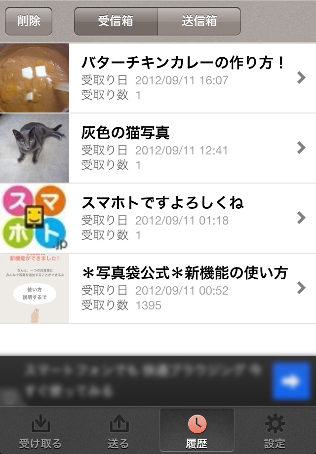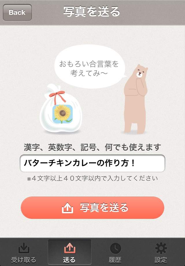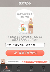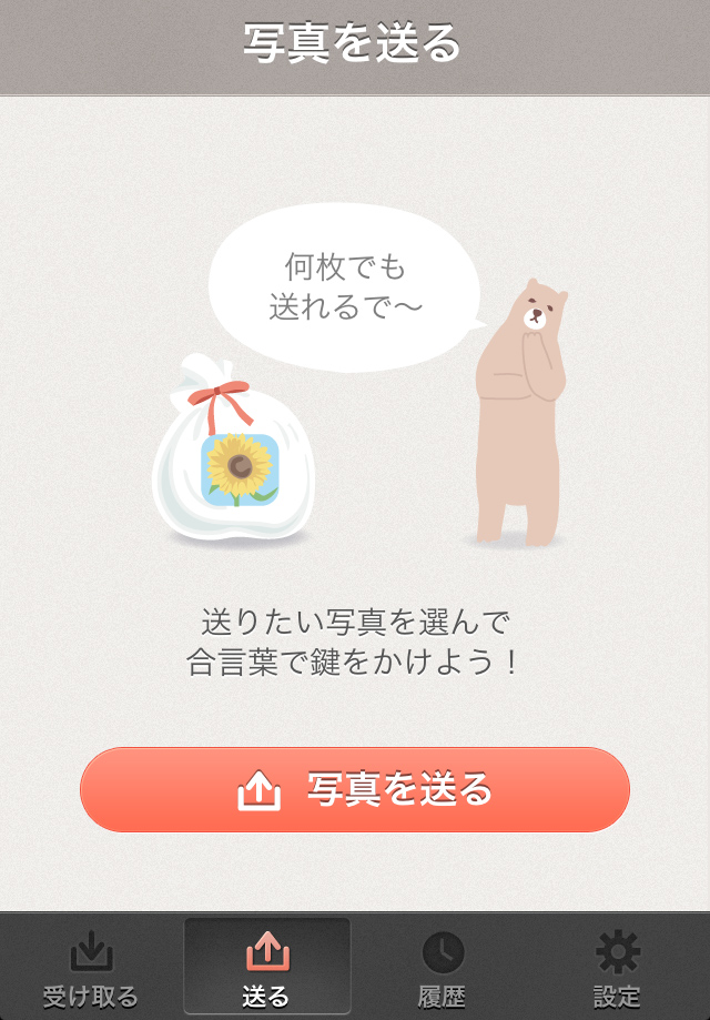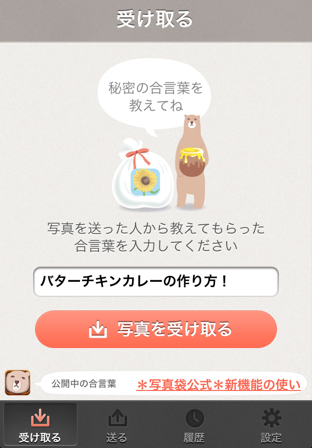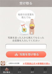 [受け取る]メニューを開き、合言葉を入力して[写真を受け取る]をタップ。受け取りが終わると、[受け取り完了!]の画面が表示されます。[写真を確認する]をタップして、[履歴]の画面を確認してみましょう。 [受信箱]に送られた写真が入っていました![送信箱]で送った写真を確認することもできます。写真や動画は、送ってから72時間まで無料で受け取れます。72時間以降はアイテムの『ハチミツ』(一個¥85)をクマにあげると、最長2週間まで受け取れるようになります。2週間以降は、写真や動画は合言葉と共に削除されますので、写真を送ったという連絡があったら、早めに受け取りましょうね。