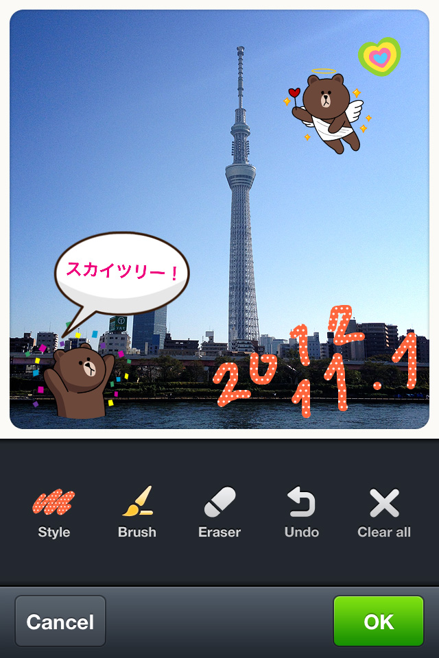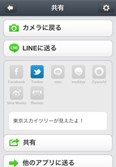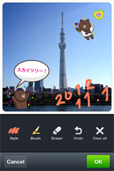 加工の際に、ブラシで描いた文字やイラストは、自動的に保存されて、オリジナルスタンプとして何度も使えるので、とても便利!撮影画面でオリジナルスタンプを単独で作ることもできますよ。「LINE camera」で加工した写真は、LINEのほか、Facebook・Twitter・mixi・weibo・renren・me2day・Cyworldに、かんたんに共有することができます。お気に入りの一枚ができたら、お友達に共有してくださいね!