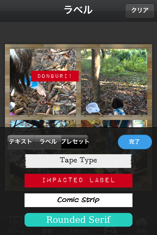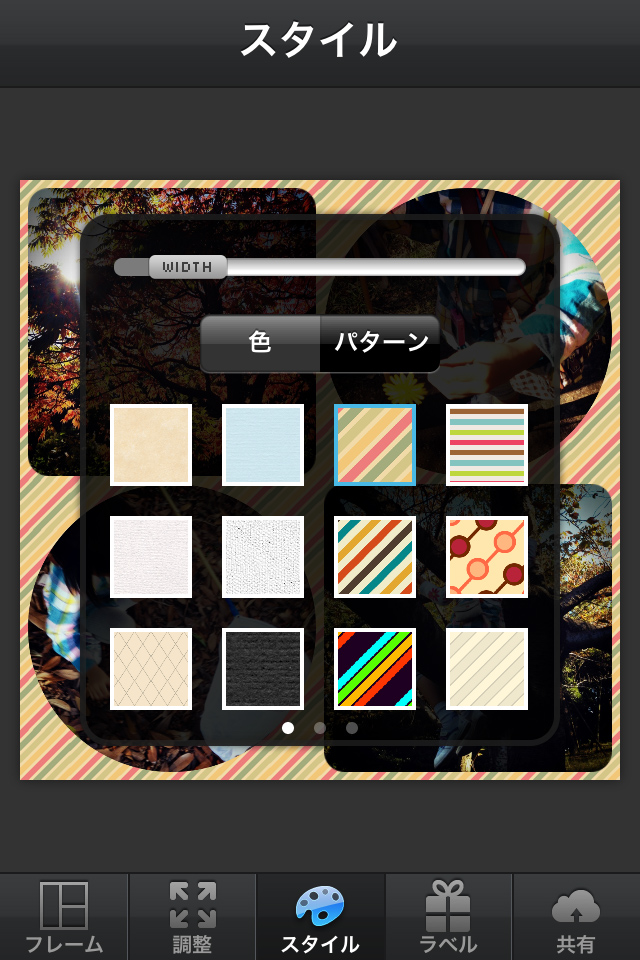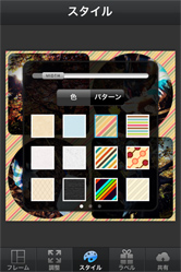 フレーム内のエリアをタップして、[カメラロール]もしくは[写真を撮影]から写真を配置しましょう。写真は、ピンチイン・ピンチアウトで拡大・縮小できます。また、フレーム同士の境界線をドラッグすると、エリアの大きさを調節することができます。もう少し装飾したいなと思ったら、画面下部のメニュー[スタイル]をタップで、枠の色やサイズを変えましょう。枠の色はカラーパレットから自由に選べますし、36のパターンからポップな柄を選ぶこともできますよ。[ラベル]メニューで、好きな文字を入れたラベルを作って写真に貼ることもできます。フォントやスタイルもおしゃれなデザインが揃っていますよ。