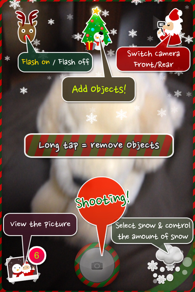 「White Christmas」は、ツリーやサンタ、トナカイなどのクリスマスアイテムで写真をデコレーションできるクリスマスシーズンにぴったりのアプリ。クリスマスパーティーで撮った写真をかわいくデコっちゃいましょう! アプリを起動すると、数秒間操作説明が表示されます。画面上部のトナカイマークはFlashのon/off、ツリーマークはアイテムの選択、サンタマークはインカメラの切り替えです。画面下部のフォトマークで撮影した写真を確認、雪マークで画面に雪のオブジェクトを追加することができます。雪のオブジェクトは3種類から選択できますよ。