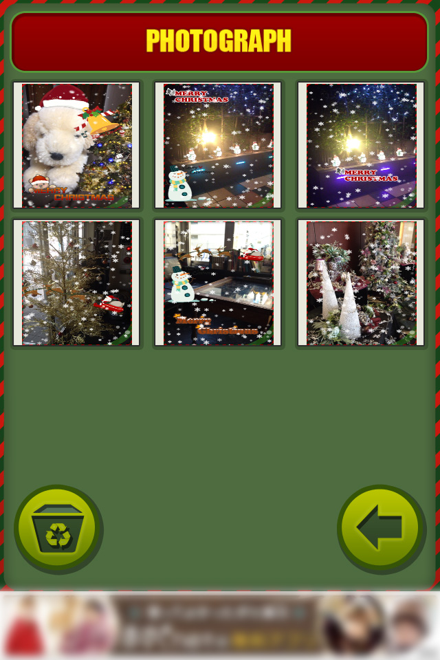 アイテムを配置したら、画面下部中央のカメラマークをタップで撮影!撮影した写真は本体ではなく、アプリに一時保存されます。画面下部のフォトマークをタップすると、撮影した写真の一覧が表示されます。写真をタップすると[VIEW][SHARE][DELETE]のメニューが表示されます。本体に保存したい場合は、[SHARE]をタップして[PHOTO ALBUM]で。Twitter・Facebook・メールでの共有もできます。クリスマスムードたっぷりのかわいい写真をたくさん作って、家族やお友達と共有してくださいね!