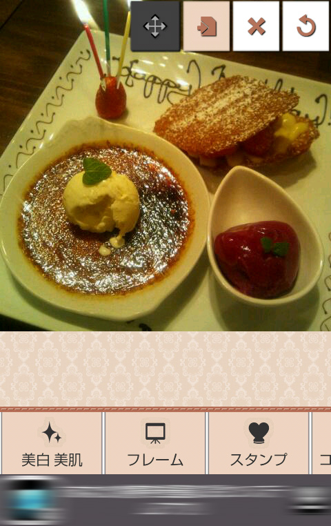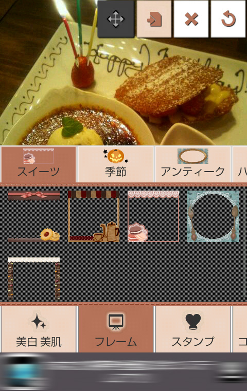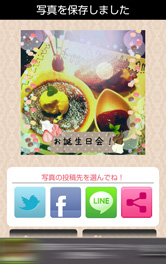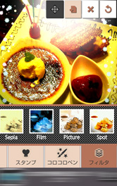 今回はお誕生日会のデザートプレートの写真をかわいくデコレーションしてみました。[テキスト]でマスキングテープのスタンプに文字を入力。ホイップクリームなどのスタンプのサイズ・角度を調整して、マスキングテープを飾りました。マカロンのコロコロペンで左右をフレーム風に。フィルタは[Spot]で画面上部を明るくし、[Circle]のエフェクトで丸い光を追加。気に入らなかったときは、画面上部メニューの一番右の[回転矢印]マークをタップすると、一つ前の状態に戻すことができます。最初からすべてやり直す場合は、[×]マークをタップしてくださいね。 とってもかわいいデコ写真ができました!画面上部メニューの左から二番目のマークをタップして保存。保存した画像はSNSへかんたんに投稿できるので、みんなに自慢しちゃいましょう♪