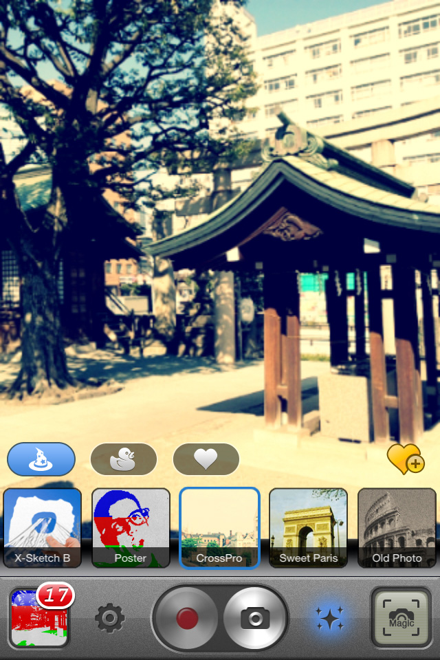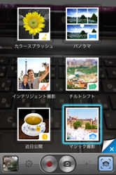 [マジック撮影]を試してみましょう。撮影画面の左下に表示されているエフェクト名をタップすると、エフェクトを切り替えることができます。また、撮影ボタンの右のマークをタップすると、画面下にエフェクト一覧が表示されます。たくさんあるので、スライドして好みのエフェクトを選択してくださいね。撮影後に加工できるアプリは多いですが、撮影する前に被写体にぴったりのエフェクトを選ぶことができるのは新鮮ですね。その場の雰囲気や風景に合わせた写真が撮れますよ。