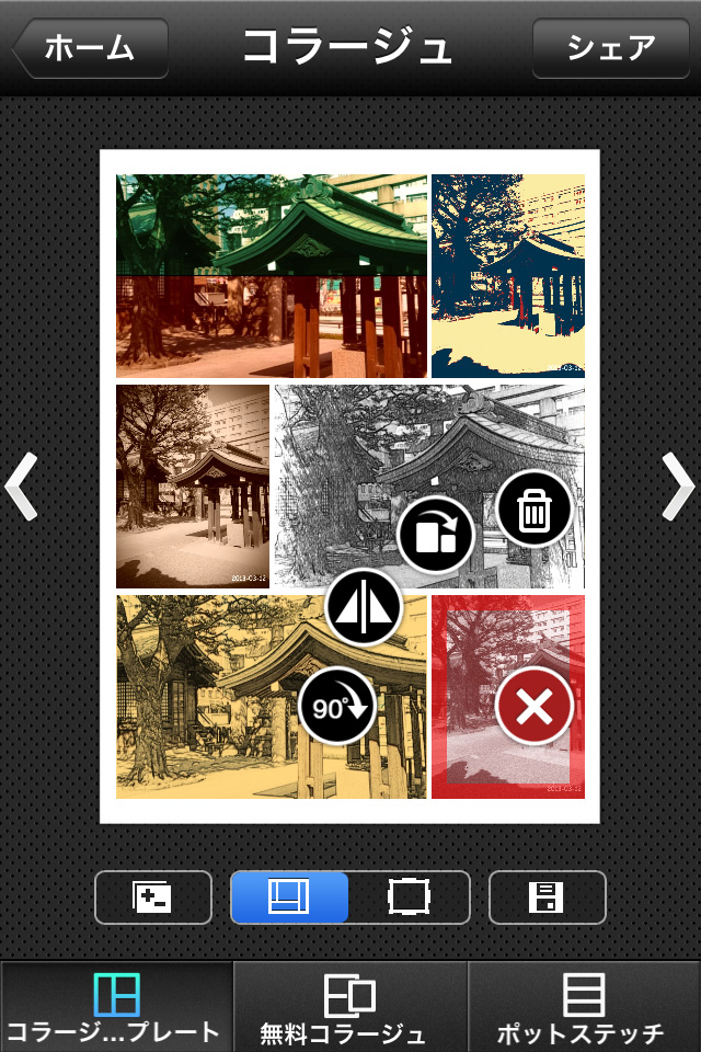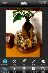 メニュー画面に戻って、[編集]メニューを選ぶと、撮影後の写真を編集することができます。[向上させる]では、[自動][光][重さ][明るさ]をそれぞれタップするだけで自動的に調整してくれます。[効果]では、撮影時と同じ様々なエフェクトを選んで加工することができます。その他[美化][トリミング][回転]など、いろいろな編集ができます。また、[コラージュ]メニューを使うと、「PowerCam™」で撮影した写真や端末に保存されている写真を、好みのレイアウトで組み合わせて1枚の写真にすることができます。撮影・編集・コラージュした写真は、TwitterやFacebookなどのSNSにメッセージ付きで投稿できるので、素敵な写真ができたらみんなに自慢しちゃいましょう♪