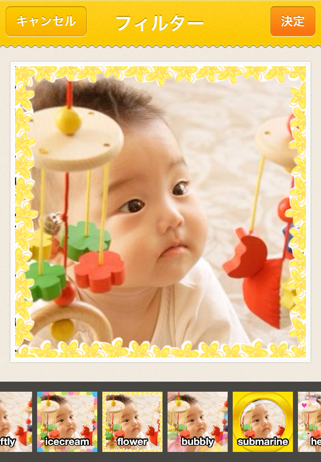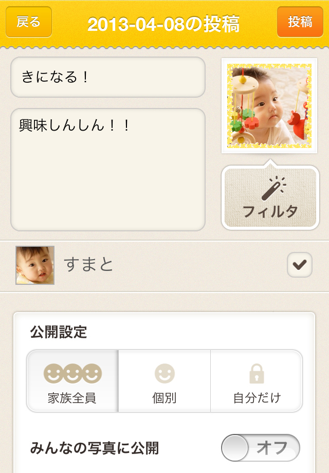 設定が終わったら、子どもの写真を撮りましょう!画面下部のオレンジのカメラボタンをタップするとカメラが起動します。保存されている写真を使いたい場合は、右下の[写真選択]をタップして写真を選んでくださいね。タイトルとコメントを入力したり、写真を共有するSNSをFacebook・Twitter・mixiから選択したり、子どもが二人以上いるときは、写っている子どもの名前を選択したりできます。また、写真にかわいいフィルタをかけることもできます。写真の公開設定は、[共有範囲]メニューから。共有範囲を[家族全員][個別][自分だけ]に都度設定することができます。また、[みんなの写真に公開]のオン/オフもここで設定できます。一通り設定が終わったら、右上の[投稿]をタップして、投稿しましょう。iPhone版のver2.1からは、動画の投稿もできるようになりました!今しかないこどもの成長記録を、動く姿と声でnicoriに残せます。(お試しは3回まで無料、無制限使用は31日間350円)
