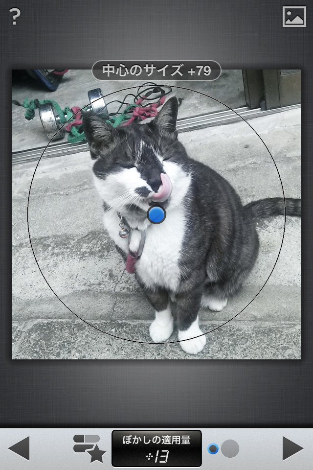 加工メニューは左から、[AUTOMATIC(自動補正)][SELECTIV ADJUST(選択による調節)] [TUNE IMAGE(画像を調整)] [STRAIGHTEN(真っ直ぐにして回転)][CROP(クロップ)] [DETAILS()][BLACK&WHITE(モノクロ)] [VINTAGE(ビンテージ フィルム)] [DRAMA(ドラマ)] [GRUNGE(グランジ)][CENTER FOCUS(中心フォーカス)] [TILT SHIFT(傾きと変化)][RETROLUX(レトロラックス)] [FRAME(フレーム)]の14種類。左の画像は[CENTER FOCUS(中心フォーカス)] を使ってみました。周りや背景をぼかしたり、輝度を調整して、被写体を際立たせることができます。中心のサイズはピンチイン・ピンチアウトで調整。右の画像は、[FRAME(フレーム)]でフィルム風に仕上げてみました。各メニューでの加工は、組み合わせることができるので、時間をかけて時間好みの加工を行うことができますよ。画面下部の◀マークで加工の取り消し、▶マークで加工を確定します。