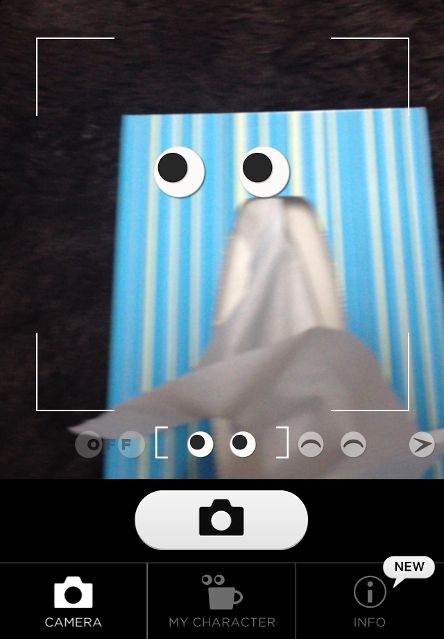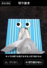 アプリを起動すると、カメラが立ち上がります。撮影画面で、まずは目玉の種類を選びましょう。シャッターボタンの上に目玉が表示されています。目玉は21種類もあるので、被写体に合わせてぴったりな目玉を選んでくださいね。左右の目玉の位置は固定なので、カメラを傾けたり、被写体の位置を調整することで、しっくりくるポジションを作りましょう。位置を合わせたら、シャッターボタンをタップして撮影!撮影後、[切り抜き]の画面が表示されます。背景に余計なものが写ってしまったときなどは、キャラの周りを指でなぞってから [切り抜く]をタップすると、キャラだけを切り抜くことができます。切り抜きが不要な場合は、[切り抜かない]をタップして、次の画面へ。