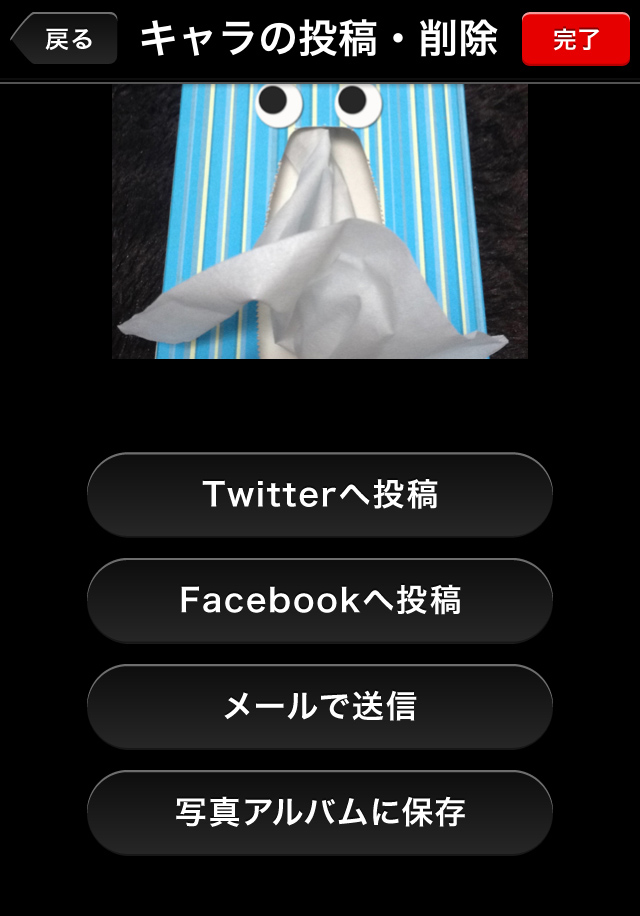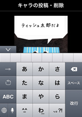 キャラができたら、次はフキダシにコメントを入れましょう。[キャラの投稿・削除]の画面が表示されたら、フキダシをタップ。文字入力画面になるので、好きなコメントを入力しましょう。被写体に合ったコメントを入れると楽しいですよ!入力したコメントは手書き風の可愛いフォントで表示されます。コメントの入力が終わったら、キャラ作り完成!端末に保存する場合は[写真アルバムに保存]をタップしてください。TwitterやFacebookなどのSNSで共有する場合は、[Twitterへ投稿][Facebookへ投稿]を、メールで送りたいときは[メールで送信]を、それぞれタップしましょう。
