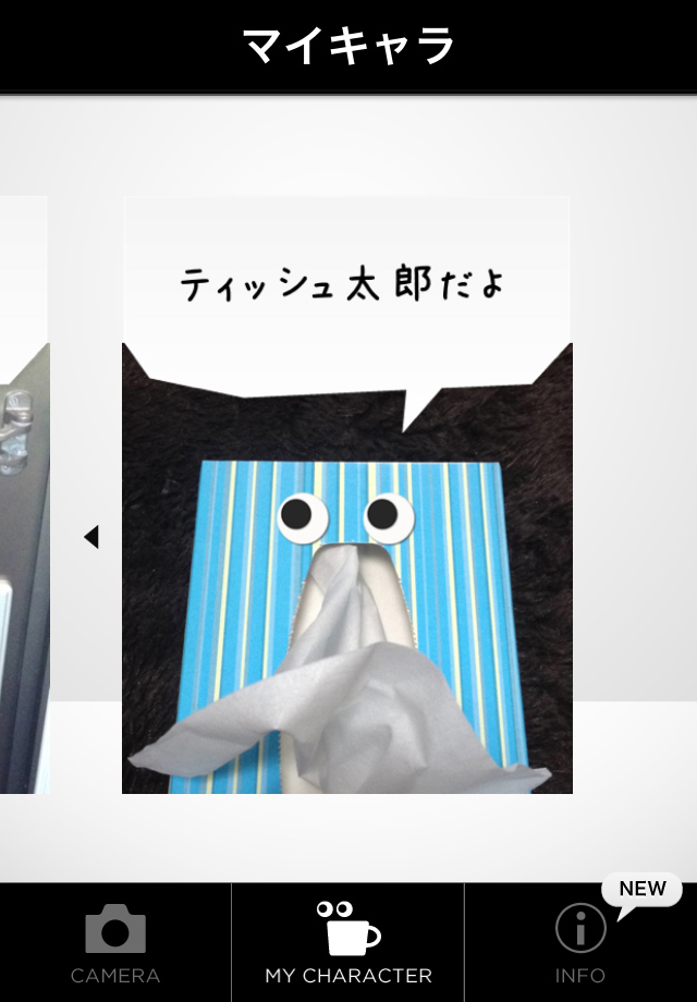 撮影画面下部の[MY CHARACTER]メニューをタップすると、[マイキャラ]の画面が表示され、これまでに作ったキャラを確認することができます。[マイキャラ]の画面では、コメントの編集を行うことができます。同じ写真に別のコメントを付けて投稿するのも楽しそうです。お気に入りのアイテムや新しく買った雑貨などをSNSに投稿するとき、この「スモールキャラカメラN」でかわいい目玉付きのキャラにすると、より愛着が湧いてくる気がします!モノだけではなく、空や海、食べ物などに目玉を付けておもしろい写真を作ることもできますよ。「スモールキャラカメラN」で、身の回りのモノに素敵な個性を与えてあげてくださいね♪