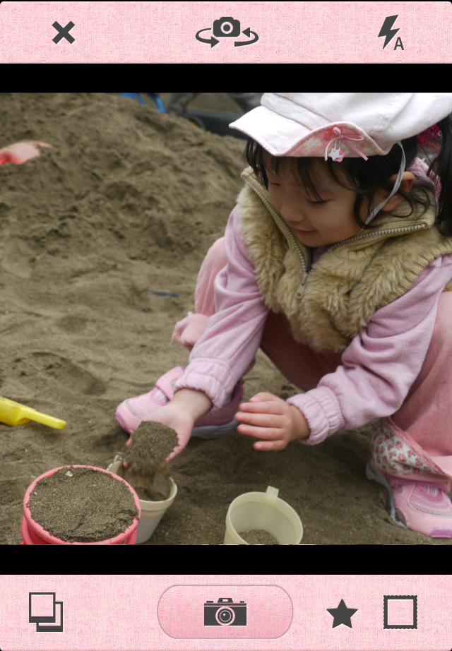 アプリをダウンロードして起動すると、Home画面が表示されます。Homeには、[camera][scrapbook][Picute Mall]の3つのメニューがあり、[camera]は撮影画面、[scrapbook]は複数の写真を組み合わせてコラージュできるメニュー、[Picute Mall]は新しいスタンプを入手できるショップです。[Picute Mall]をタップして、どんなスタンプがあるかチェックしておきましょう。『ハローキティ』『マイメロディ』『リトルツインスターズ(キキララ)』などのサンリオスタンプや、『くまモン』『まるねこCLUB』など、かわいいスタンプが勢揃い!無料~¥85なので、お気に入りのキャラがいたら、ダウンロードしておきましょう。それでは、かわいい写真作りスタート![camera]をタップすると、カメラが起動します。画面右下の星マーク(★)をタップすると、エフェクトフィルタを選ぶことができ、撮影時にリアルタイムで反映されます。四角マーク(□)はフォトフレームです。こちらも好きなものを選んでタップすると、フレームが付いた状態で撮影することができます。どんな写真になるかイメージしながら撮影できるのは嬉しいですね。フィルタやフレームを選択したら、カメラマークをタップして撮影。端末に保存されている写真を加工する場合は、画面下部一番左のマークをタップして選択しましょう。