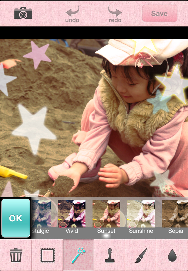 写真が用意できたら、次はデコレーションです。画面下部のゴミ箱マークの隣から、[フォトフレーム][エフェクトフィルタ][スタンプ][手書きペン][ぼかし加工(ティルトシフト)]です。[フォトフレーム]は角丸や手書き風など約50種類。[エフェクトフィルタ]は、定番のビンテージやセピア、トイカメラ風など28種類。エフェクトをタッチして選ぶだけで加工ができますし、コントラストや明るさを自由に調整することもできます。[スタンプ]はノーマルスタンプ、ローラースタンプ、ラベルスタンプ、テキストスタンプの4種類。スタンプを選んで画面に配置しましょう。配置したスタンプは位置・大きさ・角度を自由に変えることができます。ピンチイン・ピンチアウトでサイズ変更、二本指でタッチしながら左右に動かすと角度を付けることも。タッチしたときに表示されるボタンメニューでもサイズ・角度の変更ができます。[ぼかし加工(ティルトシフト)]では、一眼レフで撮影したような背景をぼかした写真やミニチュア風写真に加工することができます。加工が終わったら、画面右上の[Save]をタップで、本体に保存されます。保存後、[共有]の画面が表示され、画面右下の共有マークをタップすると、[mail][twitter][facebook][LINE][Instagram][Ring it!][他のアプリに送る]という共有メニューが表示されます。いつもの写真をおしゃれにかわいく加工して楽しい写真を作ったら、どんどん共有しちゃいましょう!