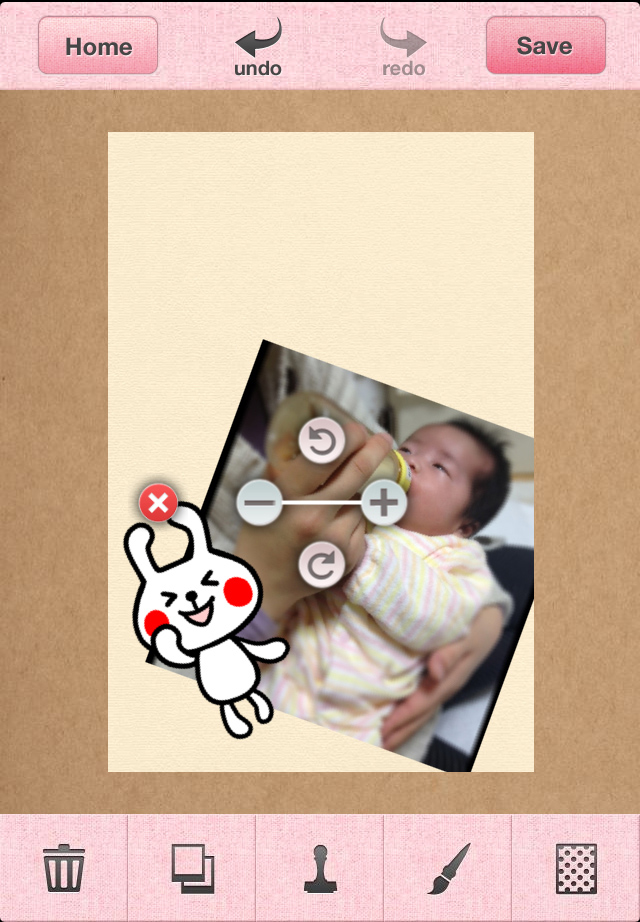 お気に入りの写真がたくさん撮れたら、コラージュ画像を作りましょう!Home画面に戻り、[scrapbook]メニューをタップすると、スクラップブックの作成画面が表示されます。スマートフォンに保存されている写真を呼び出して、画面中央の白い部分に貼り付けましょう。また、スクラップブックでもノーマルスタンプ・ローラースタンプ・ラベルスタンプ・テキストスタンプ・手書きペンの5種類のデコレーション加工機能を使うことができます。「Picute」で撮影・デコレーションした写真はもちろん、他のアプリで撮影した画像も使えるのが嬉しいですね。コラージュ画像の背景になる画像も選べます。ナチュラルなホワイトウッドやかわいいデニムなどいろんな種類がありますよ。