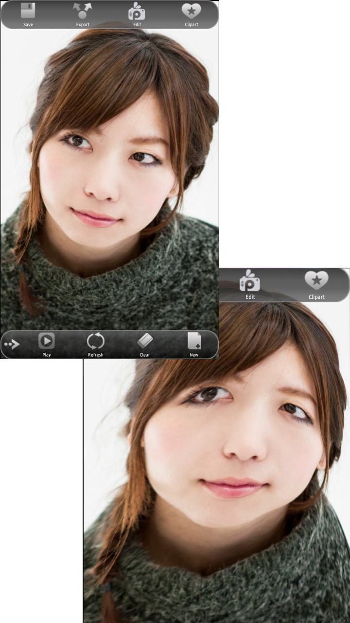 画面下部のメニューの[Play]をタップしてみましょう。画面をタッチすると、水に触れたように波紋が浮かんできます。写真が液体になったような、水の下に写真があるような不思議な状態です。この状態でスマートフォンを傾けると、傾けた方向に液体が流れるように写真が動きます。 [Pause]をタップすると、その状態で静止します。スマートフォンを上下・左右・奥・手前などに傾けて、おもしろい写真になったら[Pause]をタップ、気に入らなかったらまた[Play]をタップして動かします。動かしたり止めたりを繰り返しながら、これは!というおもしろショットを見つけましょう。[Pause]で止めた状態から、指でタッチしてさらに動きを付けることもできます。元の写真に戻したいときは、[Clear]をタップすると、読み込みしたときの状態まで戻すことができます。[New]をタップすると、写真を選択するところから新たにスタートできます。