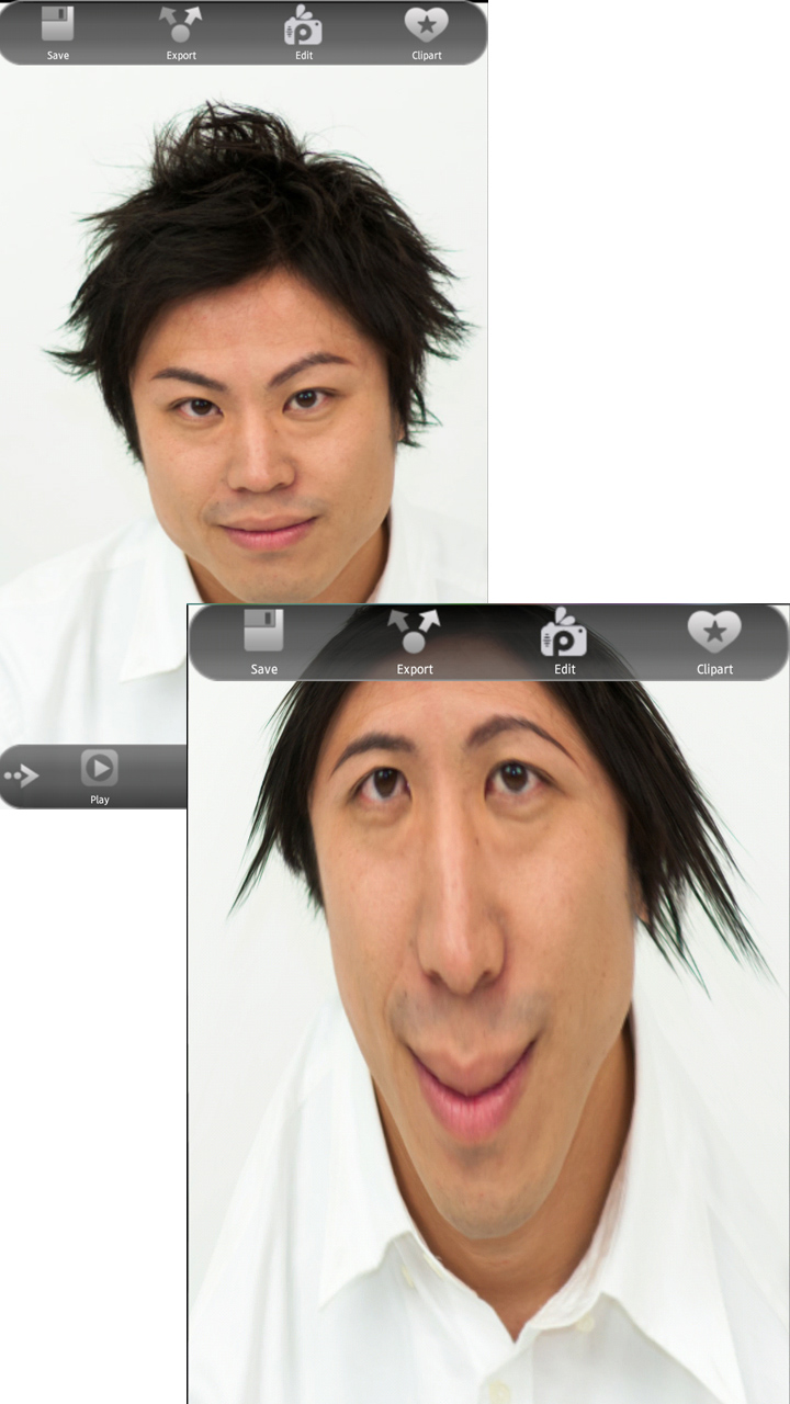 大胆に動かしすぎると、写真の外枠が歪んで、黒い下地が出てしまうこともあるので、気をつけて。でもあまり気にせずおもいっきりいじってしまうのもおもしろいですよね。写真が完成したら、保存&共有!画面上部の[Save]ボタンをタップして写真を保存しましょう。[Choose image quality]という、保存する画像サイズを選択する表示が出ますので、大・小2パターンの保存サイズから選んでタップすれば保存完了。[Export]ボタンをタップすると、共有メニューが表示されます。[写真の保存]で[SDカード]と[壁紙]を選択できるほか、[写真の共有オプション]で、[PicsArt][Facebook][Flickr][Twitter][Dropbox][Bligger][Wordpress]を、[写真の送信オプション]では[SMS][Bluetooth][Gmail]を選択できます。[その他]では、[LINE][Google+]など、インストールされているアプリの中で、共有可能なアプリが表示されます。思わず笑ってしまうおもしろ写真ができたら、みんなに共有してびっくりさせちゃいましょう。友だちや家族の写真であんまり遊びすぎると、怒られちゃうかもしれませんので、要注意ですよ!