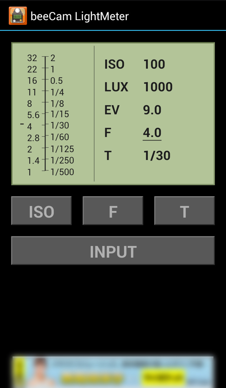 照度センサーが使用できないスマートフォンの場合は[INPUT]ボタンを押して照度またはEV※4を設定します。([INPUT]で照度とEVのどちらを入力するかは、設定メニューで設定することができます。端末のメニューボタンを押すと、設定画面が表示されるので、[測定値の選択]メニューから、[手動入力した照度を使用][手動入力したEVを使用]のどちらかを選択しましょう。)照度またはEVを設定後、「OK」ボタンを押すとメイン画面に戻ります。選択された値より、ISO(フィルム感度)、F値(絞り)、シャッタースピード(T)が算出され表示されます。これらの値をご使用のカメラにセットして撮影してください。