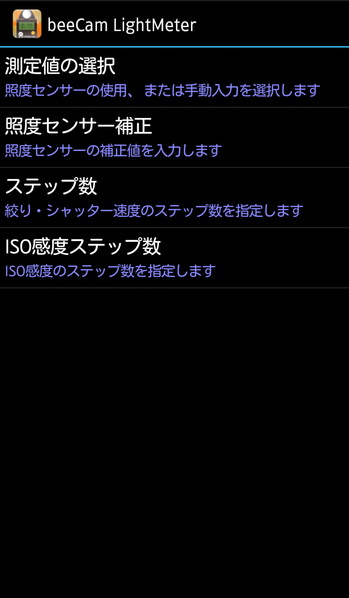 また、端末のメニューボタンを押して、[設定]画面を表示させると、[測定値の選択][照度センサー補正][ステップ数][ISO感度ステップ数]の設定ができます。照度センサーの補正を行ったり、絞り・シャッター速度のステップ数を撮影に使用するカメラと同じステップ数に変更することができ、さらに使いやすくカスタマイズできますよ。人物撮影や小物撮影をマニュアルで行いたいカメラ好きの方にオススメのアプリです!