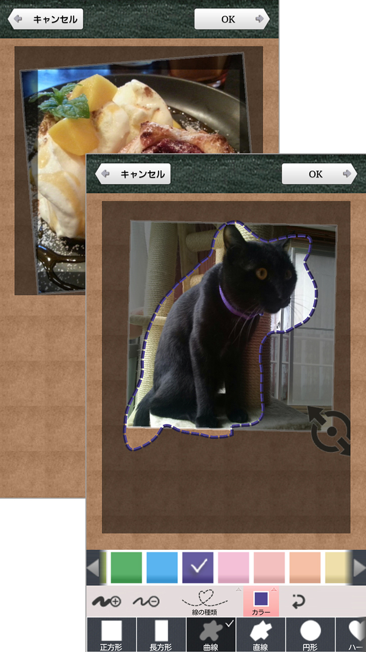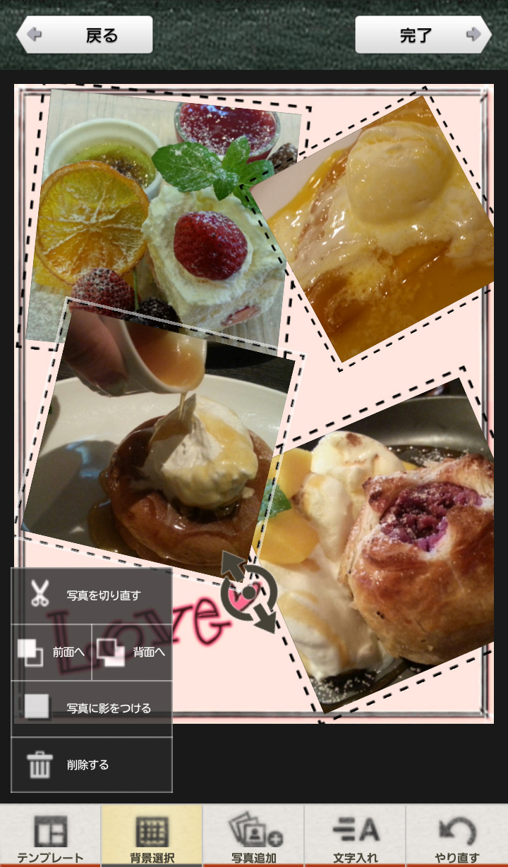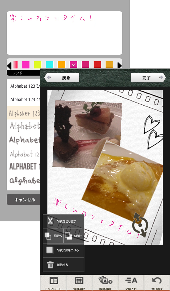 テンプレートを選択した場合は、決められた枚数の写真を選択するだけで、コラージュが出来上がります。一度配置した写真を別の写真に変えたい場合は、写真をタップして、左下に表示される[写真を選択する]をタップして、新たな写真を選択しましょう。また、テンプレートを使用した状態から[背景選択]をタップして、好きな背景をタップすると、写真のレイアウトはそのままに、背景画像だけを変えることもできます。文字を追加したい場合は、[文字入れ]をタップ。文字を入力し、34種類のカラーと30種類のフォントから好きなテイストを選んで、コラージュ画像に追加することができます。テンプレートを使わない場合は、写真を複数枚配置することができます。画面下部の[写真追加]をタップして、写真を追加しましょう。配置する写真はそれぞれ好きな形に切り抜けるので、コラージュの幅も広がりますね!一度配置した写真を切り直したいときは、左下に表示される[写真を切り直す]をタップしましょう。写真はタッチしながら好きなところに動かすことができますし、写真の重なりの前後を変えたり、影を付けることもできますよ。