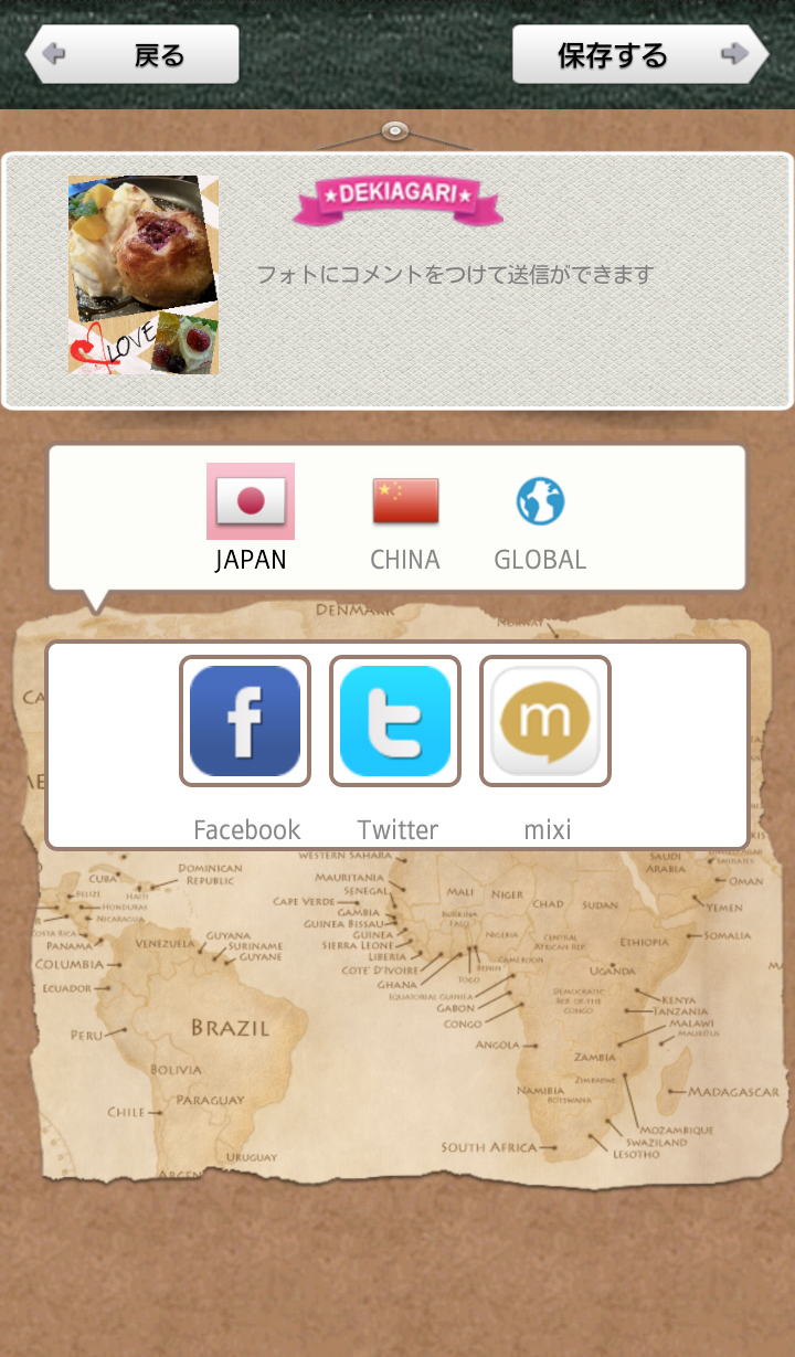コラージュ画像が完成したら右上の[完了]をタップすると、できあがりの画面が表示されますので、右上の[保存する]をタップして保存しましょう。コメントを入力してSNSへ共有することもできますよ。[JAPAN]では、Facebook・Twitter・mixi、[CHINA]ではRenRen、[GLOBAL]ではFacebook・Twitterに対応しています。かわいいコラージュ画像ができたら、お友達やご家族にシェアしちゃいましょう!