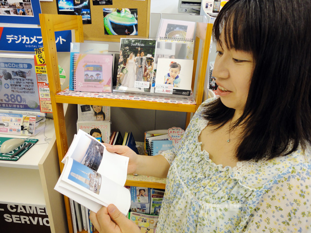 店頭やネット注文で作れるフォトブックに興味津々の百瀬さん。