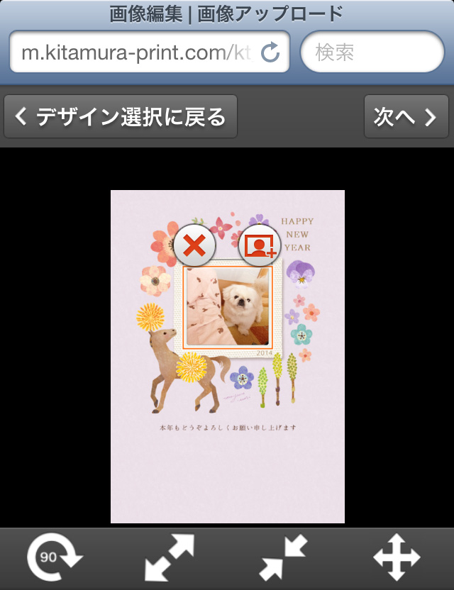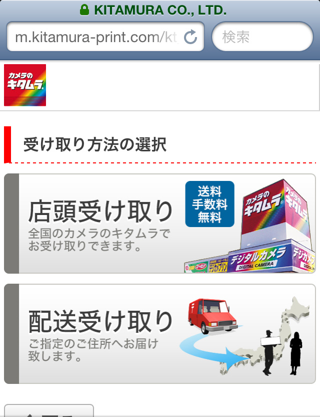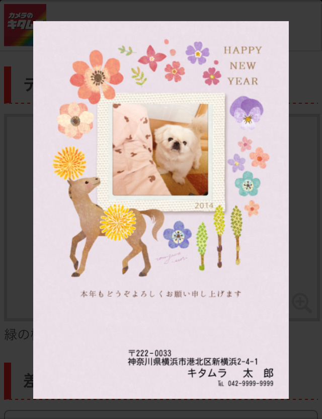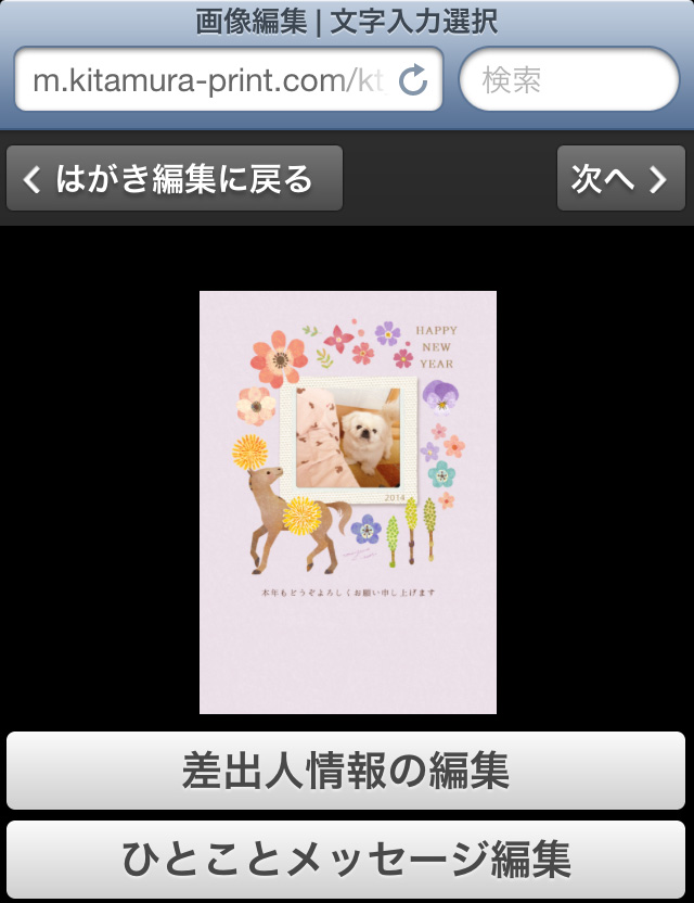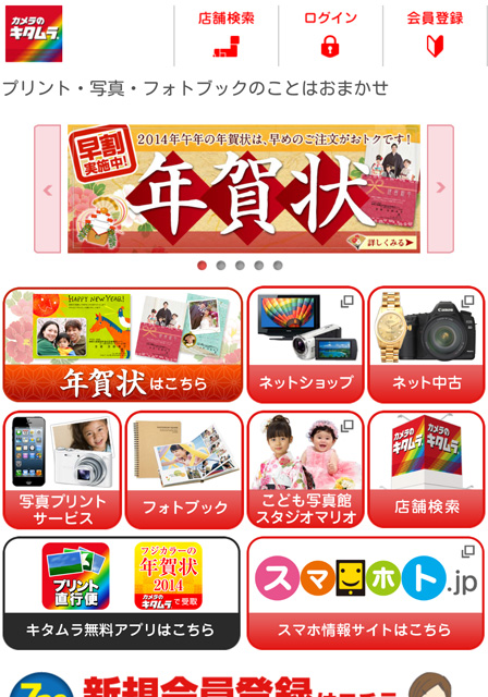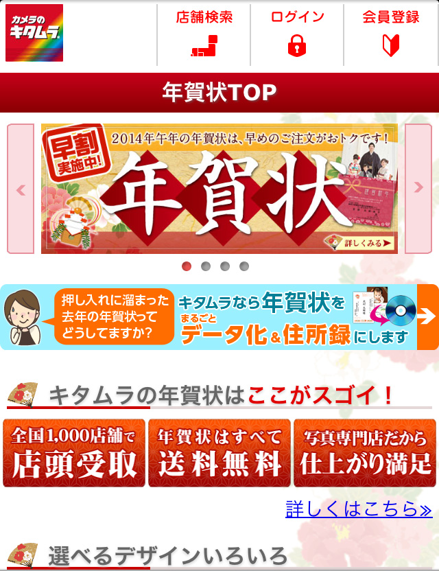 カメラのキタムラのサイトにスマートフォンでアクセスし、「年賀状はこちら」を選択しても注文ページに飛べますよ。