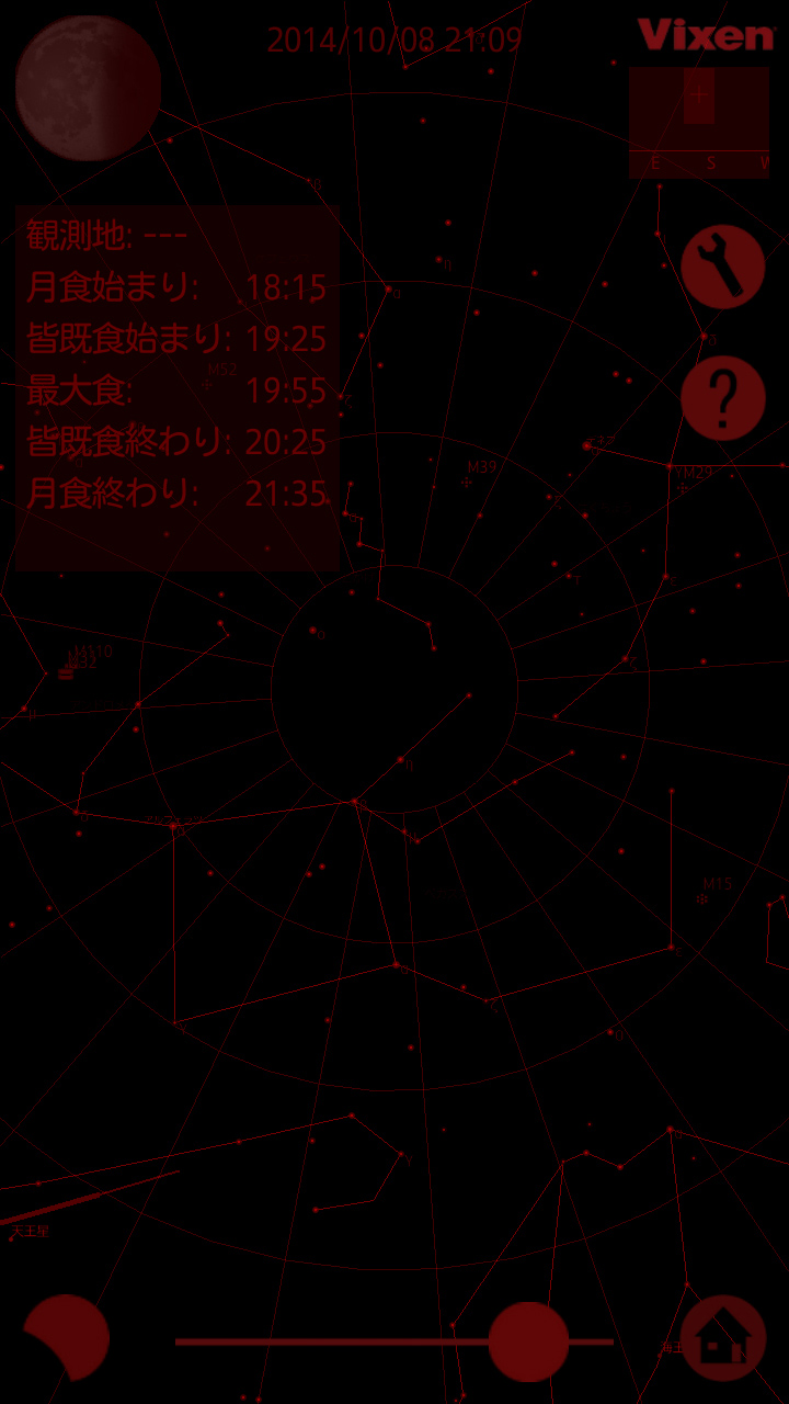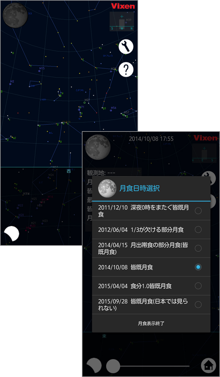 今回はAndroid版で解説しますね。アプリを起動すると、[星図(星空の地図)モード]の画面が表示されます。画面左下の月マークをタップすると、[月食日時選択]の画面が表示され、直近の月食日時のデータが表示されます。確認したい月食日時をタップすると、[月食モード]に切り替わります。今回は、[2014/10/08 皆既月食]をタップしてみましょう。