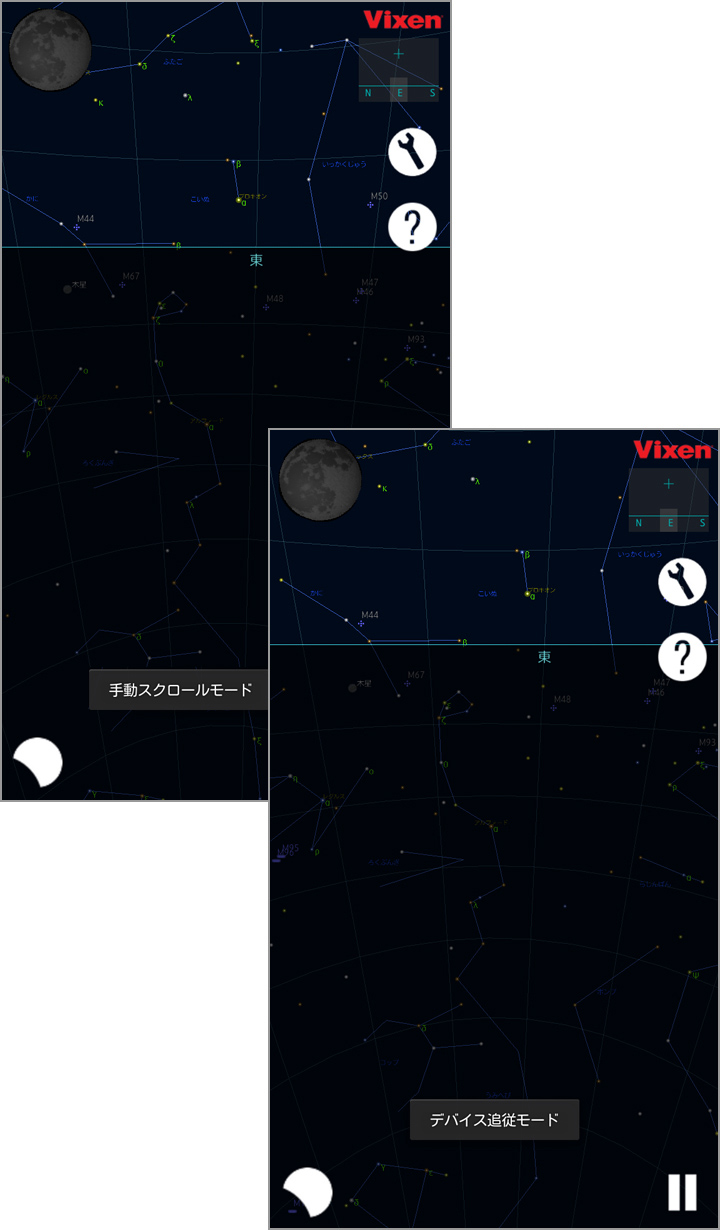 [星図モード]には、[手動スクロールモード]と[デバイス追従モード]があり、画面右下の[◎]ボタンで切り替えることができます。[手動スクロールモード]では、画面をタッチしながらスクロールすることで、好きな位置の星図を見ることができ、[デバイス追従モード]では、スマートフォンをかざした方向にある星空の様子を、リアルタイムで確認することができます。地平線下の星図も表示できます。
