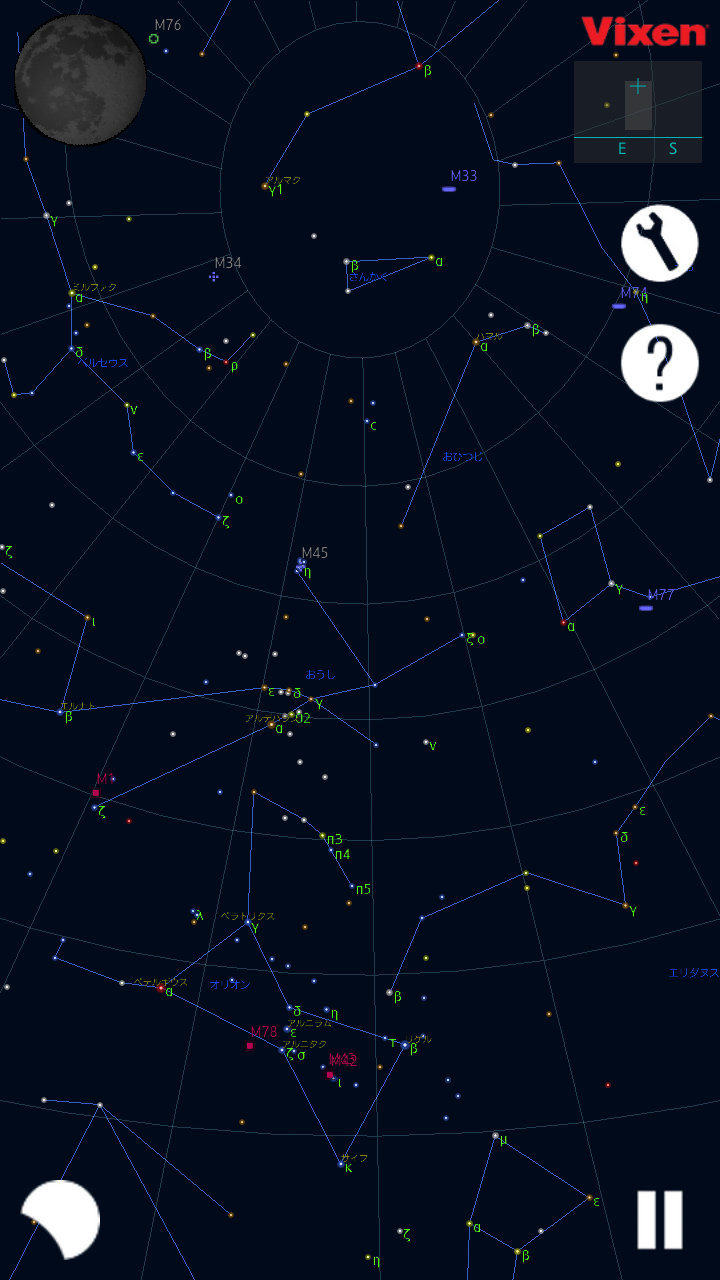 画面左下の月マークをタップし、[月食日時選択]の画面で[月食表示終了]をタップすると、[月食モード]が終了し、現在地で今見える星空の様子が表示される[星図モード]に切り替わります。