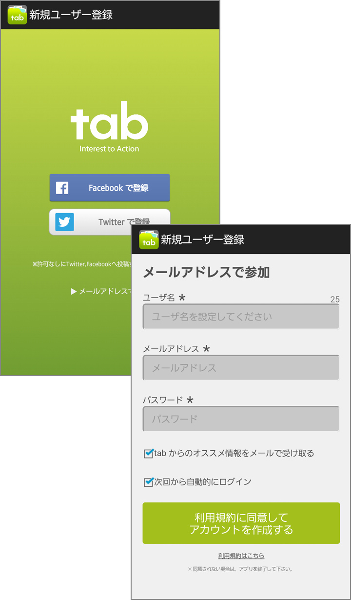 今回はAndroid版で解説しますね。アプリを起動すると、初回は[新規ユーザー登録]の画面が表示されます。Facebook・Twitterのアカウントをお持ちの方は簡単に登録できますし、お持ちでない場合はメールアドレスでの登録もできます。