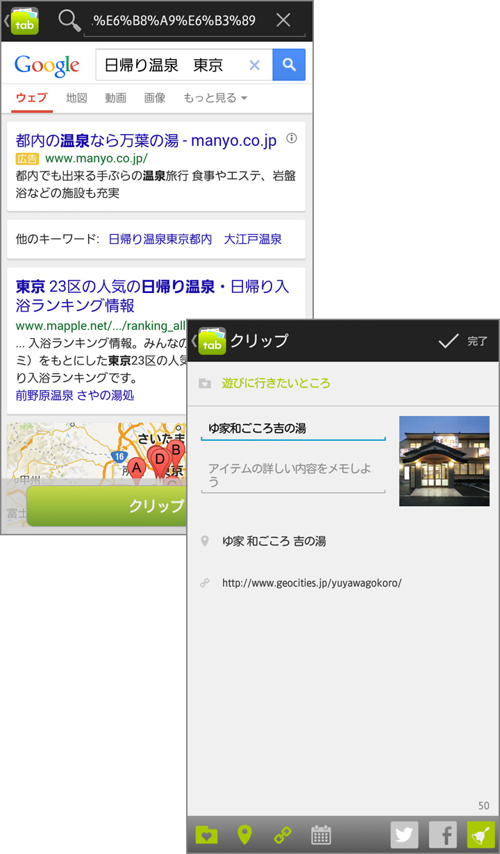 Google検索での検索結果が表示されるので、お目当てのサイトを表示させたら、画面下部の[クリップ]をタップ。[クリップ]画面が表示されるので、保存先のtab帳・アイテム名・アイテム内容のメモ・マップ・リンク・写真を設定しましょう。アイテム名・マップ・リンク・写真は、クリップするサイトから簡単に引用できます。