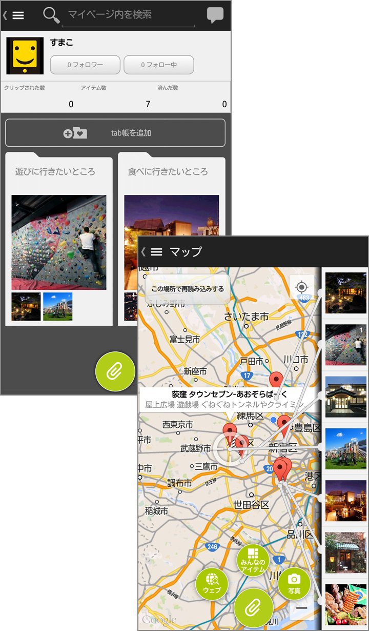 メイン画面左上のメニューボタンから、[マイページ]をタップすると、自分のtab帳を確認することができます。tab帳は好きな名前を付けて作成することができるので、目的別に分けておくと便利です。tab帳をタップすると、クリップしたアイテムの内容を見ることができます。