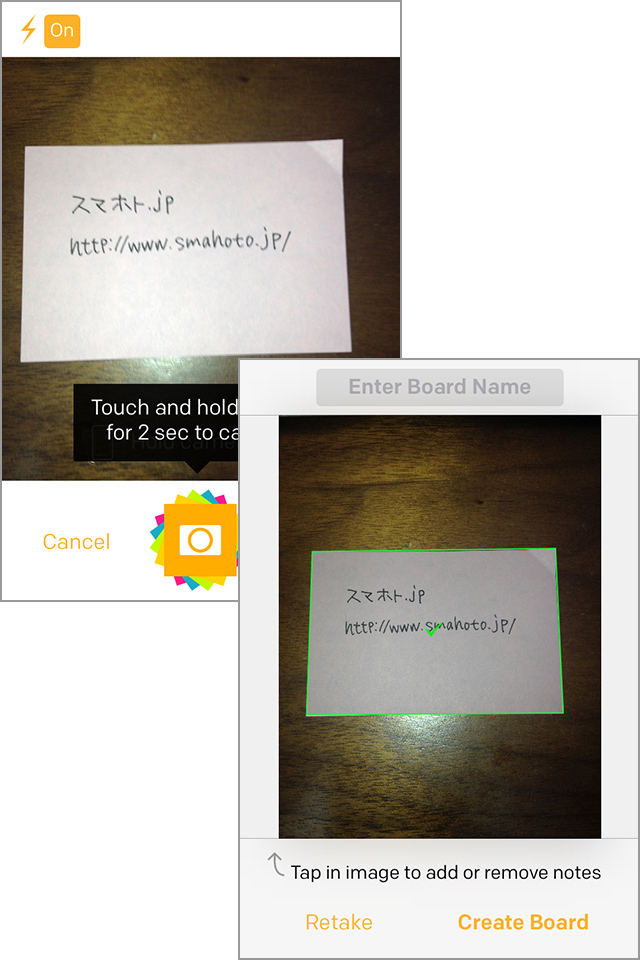 [Board]という画面が表示されたら、まず画面下部のカメラアイコンをタップします。自動的にカメラが起動するので、取り込みたいポストイットを撮影画面に収めたら、画面内のポストイットを2秒間長押しすると撮影できます。
