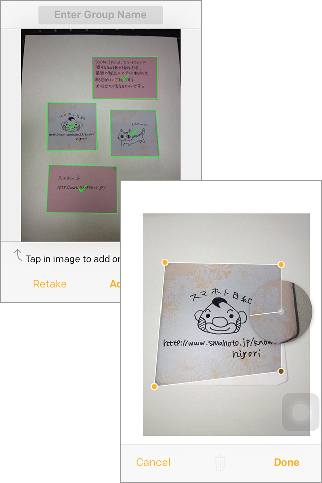 ポストイットがうまく自動認識されなかった場合は、[Tap in image to add or remove notes]という表示が出ますので、画面内のポストイットを長押ししてみましょう。ポストイットの角にオレンジの丸と周囲に白い線が表示されるので、このオレンジの丸をタッチ操作して、ポストイットの形に合わせ、[Done]をタップ。ポストイットが認識されて、画面右下に[Add to Board]ボタンが表示されました。