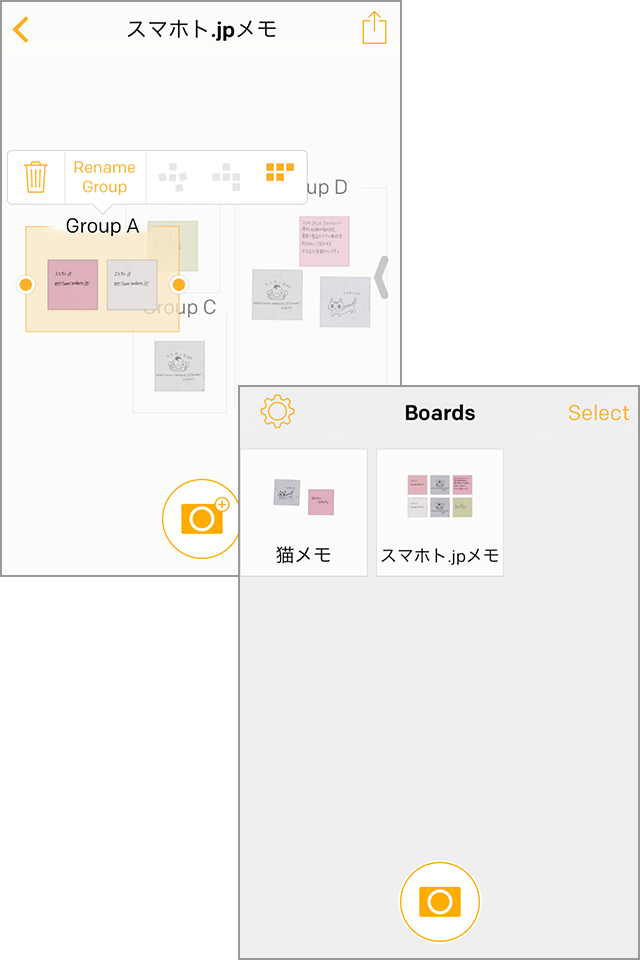 [Group A]の文字をタップすると、削除やグループ名変更、並び替えのメニューが表示されます。パネルの形のアイコンをタップすると、バラバラに置かれたポストイットを整列させることができます。