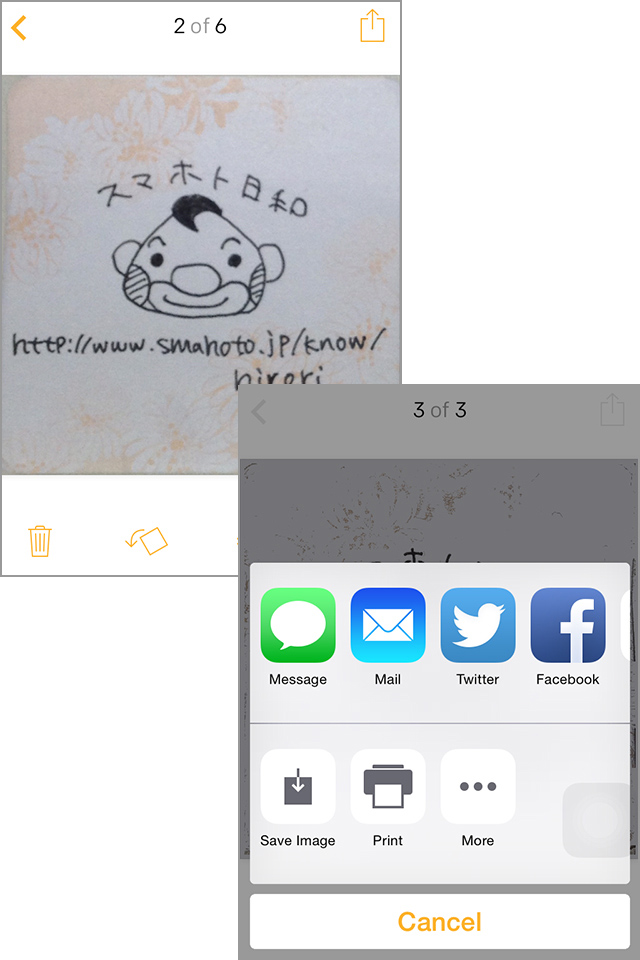 [Group]内のポストイットをタップすると、デジタル化されたポストイットを見ることができます。画面左下の[ゴミ箱]ボタンをタップすると削除、[回転]ボタンをタップすると、反時計回りに90度ずつ回転します。その隣の[復元]ボタンをタップすると、デジタル化する前の、撮影したままのポストイットを確認することができます。画面右上の[共有]ボタンをタップすると、メールやTwitter・Facebook・プリンターなどへ共有することもできます。