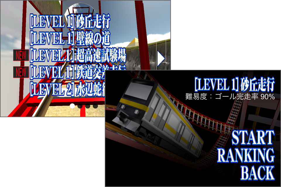 『[LEVEL 1]砂丘走行』でのプレイの様子を動画にしてみました。このコースは比較的簡単で、山なりレールや車体が傾くカーブに注意すればゴールできますが、レベルが上がるごとに、空中ループ、エレベーター、シーソー、振り子などの難関ポイントが現れます。現在一番難しいコースの『[LEVEL S] 強者の修行』の難易度は、なんと[ゴール完走率1%]!何度やってもクリアできない超難関コースでした。腕が上がったら、ぜひチャレンジしてみてくださいね!