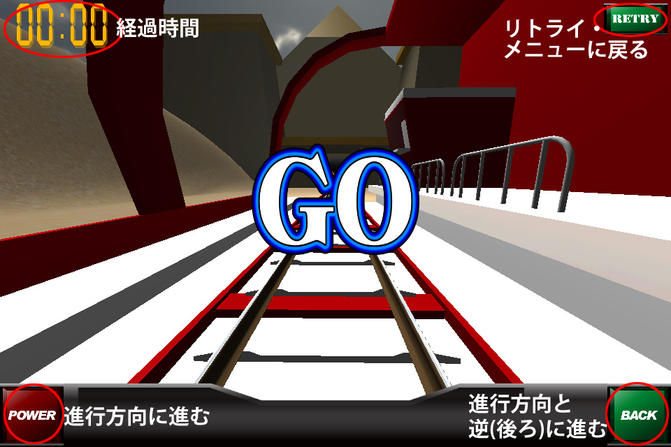 [POWER]ボタンをタップして列車を進めましょう。カーブの手前ではスピードを落としたり、斜めになっているところではスマートフォンを傾け、レールから脱線しないように注意。危険な場所の手前には[一時停止]や[スピード落とせ]などの標識があるので、注意深く見て下さいね。また、このゲームにはスピードメーターが無いので、自分の感覚でうまく調節する必要があります。