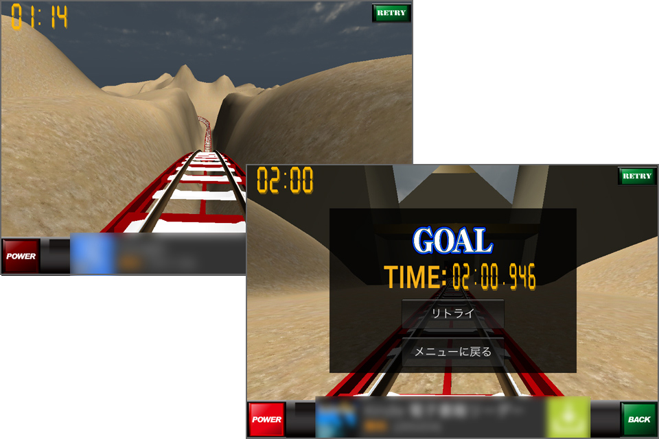 画面左上にスタートしてからの経過時間が表示されます。ゴールまでのタイムを競うゲームなので、できるだけ早くゴールできるようがんばりましょう!カーブの途中で加速しすぎたりすると、脱線してしまうことがあります。脱線するとゲームを続けることができないので、画面右上の[RETRY]をタップして、再挑戦してください。ゴールすると、タイムと[リトライ][メニューに戻る]が表示されます。
