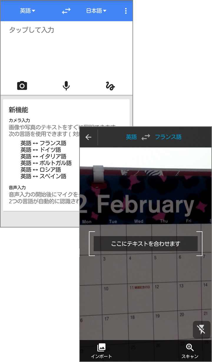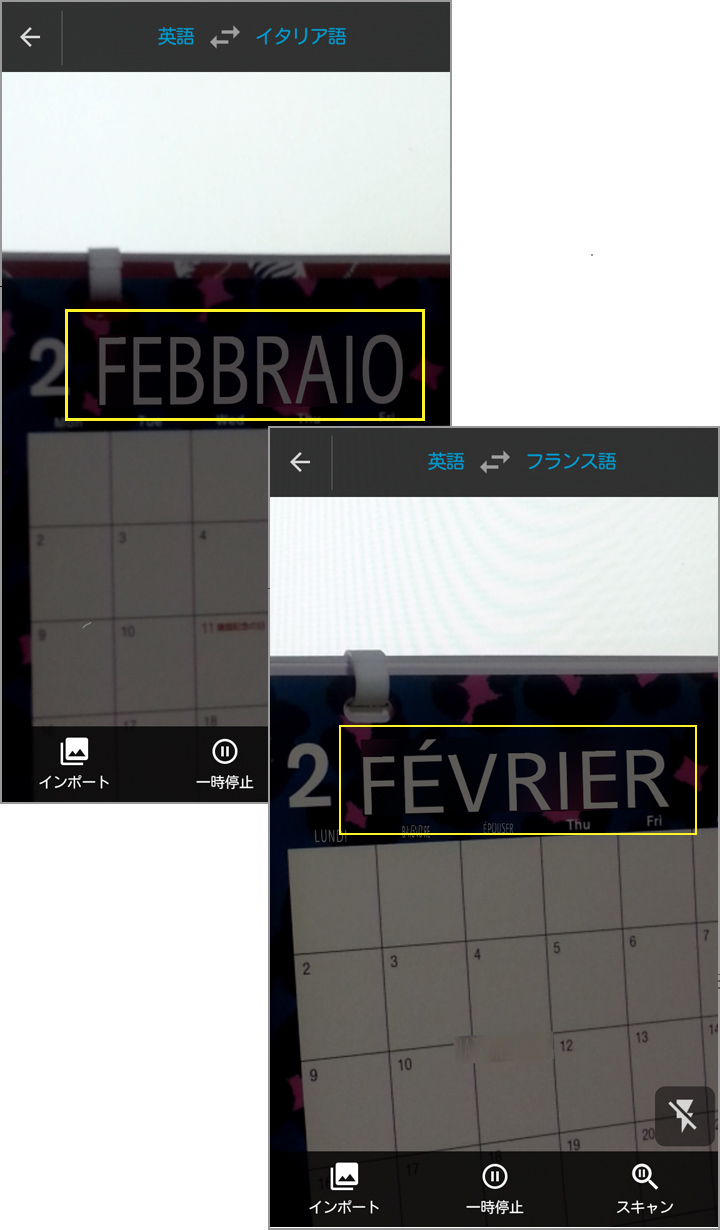 英語→イタリア語に設定し、『February』と書かれた2月のカレンダーにカメラを向けてみたところ、イタリア語『FEBBRAIO』にしっかり翻訳されました。英語→フランス語に変更すると、『FÉVRIER』とフランス語で表示されました。とても便利な機能ですね!