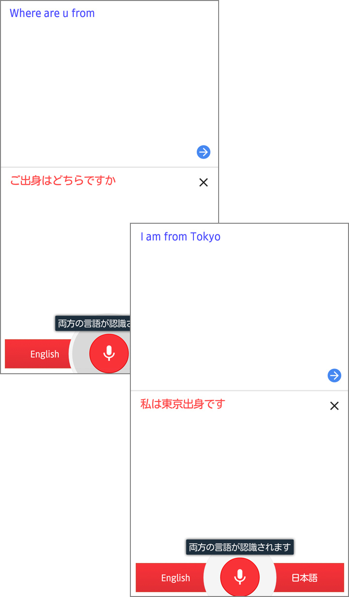 最後に、画面の下部にあるマイクアイコンをタップすると、マイクアイコンが赤色に変わり、[両方の言語が認識されます]という表示が出て、両方の言語ボタンが赤く表示されます。これ以降は、通知音が鳴ってマイクアイコンが赤色に変わるたびに、音声入力ができる状態となり、二つの言語を自動認識して翻訳してくれます。会話がスムーズにできますね!