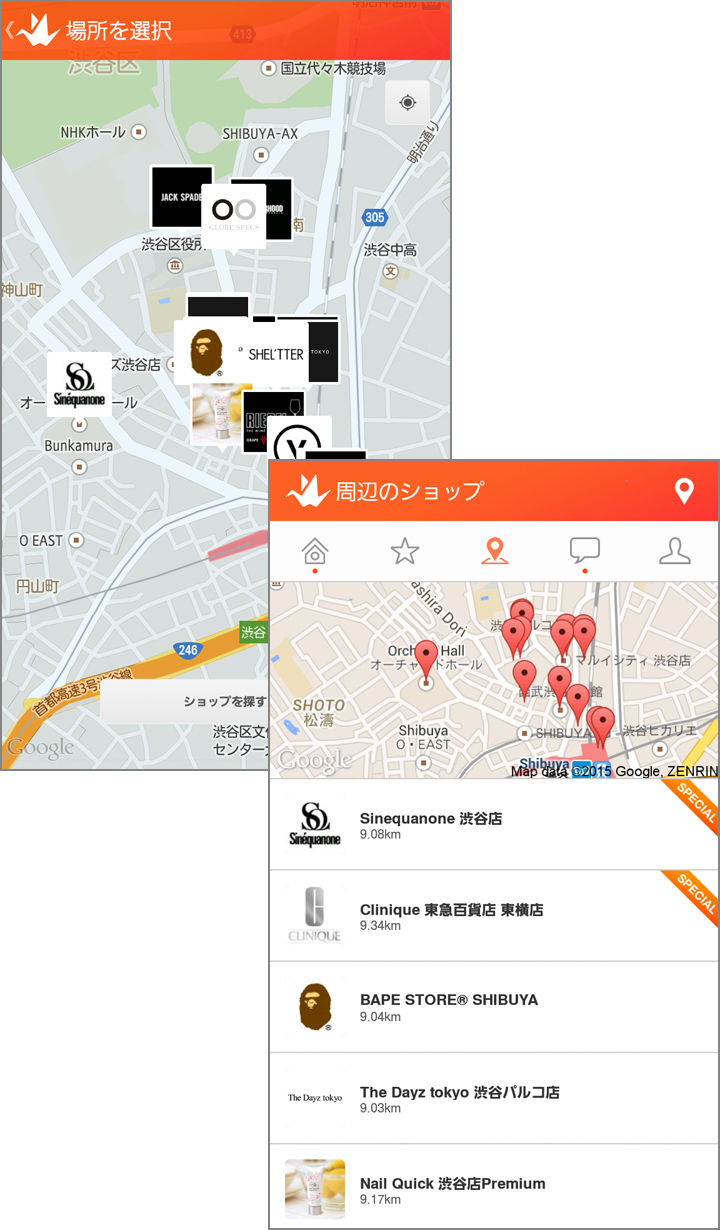 お家にいながらショッピングを楽しめる「Origami」ですが、お出かけの際にもとってもお役立ち。画面上部の[マップ]ボタンをタップすると、近くに店舗のあるブランドや、お気に入りのブランドの店舗の位置をチェックできるので、週末のお出かけやデートの際にもご利用ください。