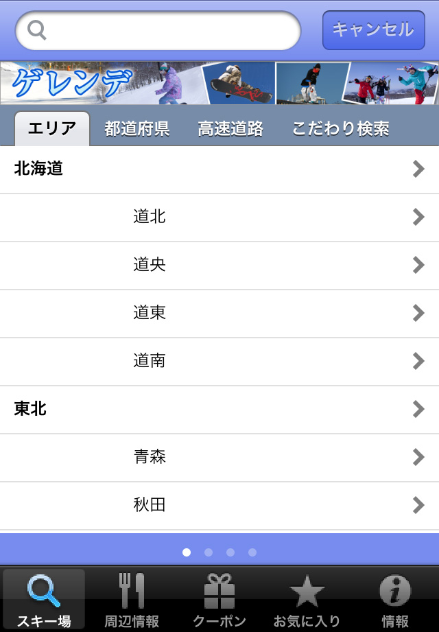 アプリを起動して、ゲレンデ情報を検索してみましょう![エリア][都道府県][高速道路][こだわり検索]から検索できます。[こだわり検索]では、スキー場エリア・本日の積雪・本日の天気・最長滑降距離・斜面構成などのスキー場の状態や設備から探したり、早朝・ナイター・スキースクール・託児所・幼児スクールなど、サービスの条件から探すことができます。